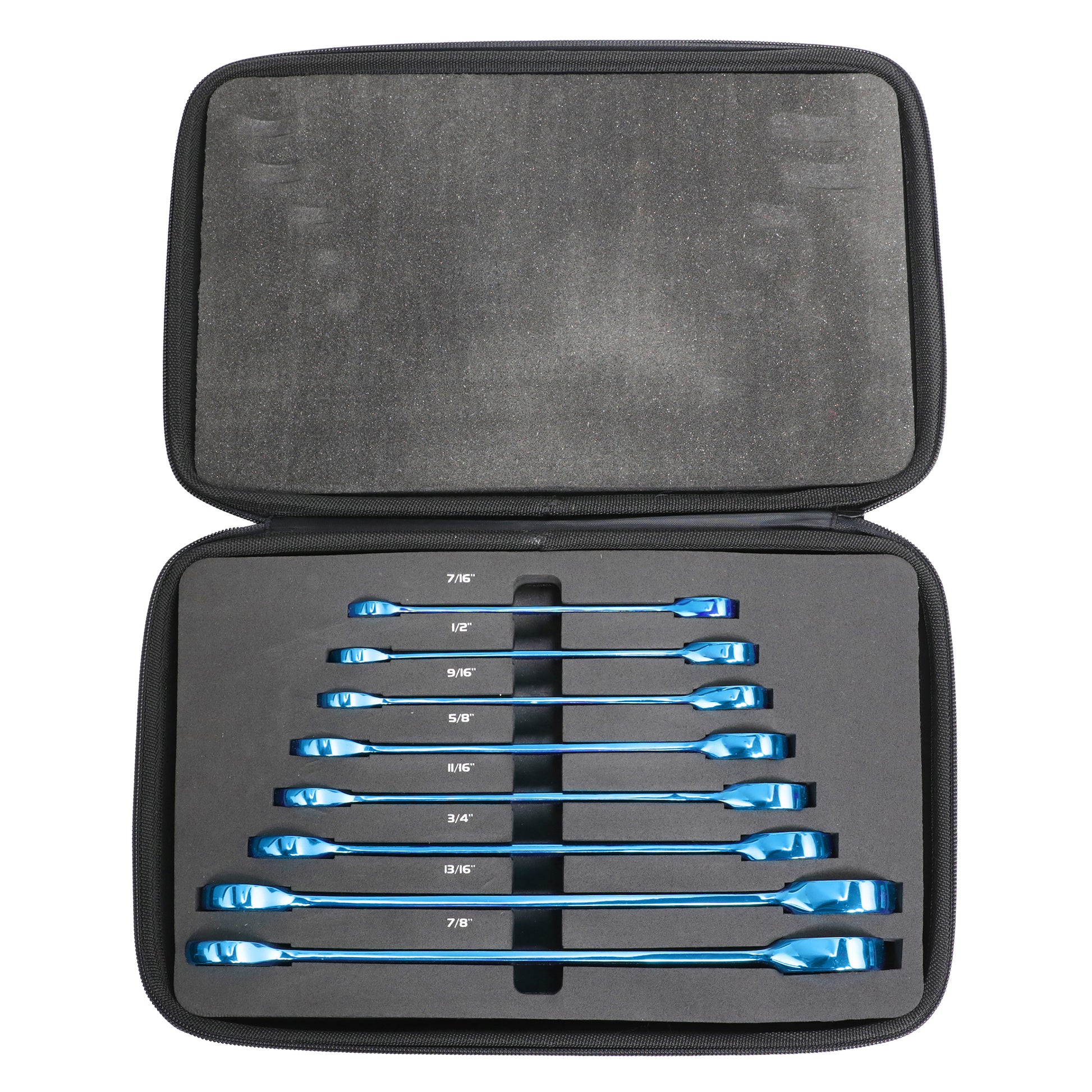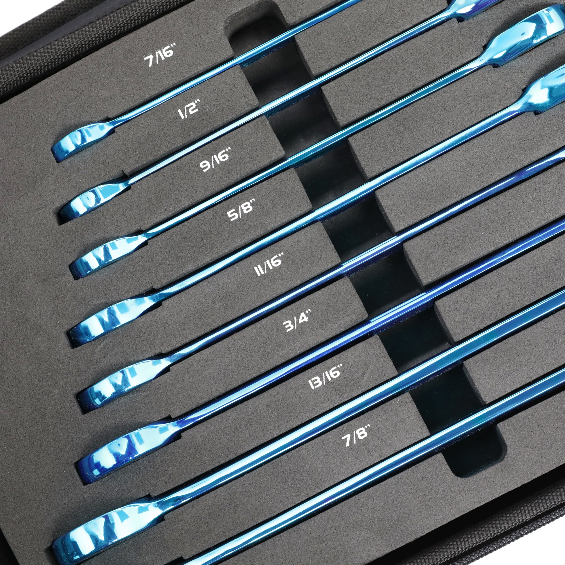 - 7/16", 1/2", 9/16", 5/8", 11/16", 3/4", 13/16" and 7/8".