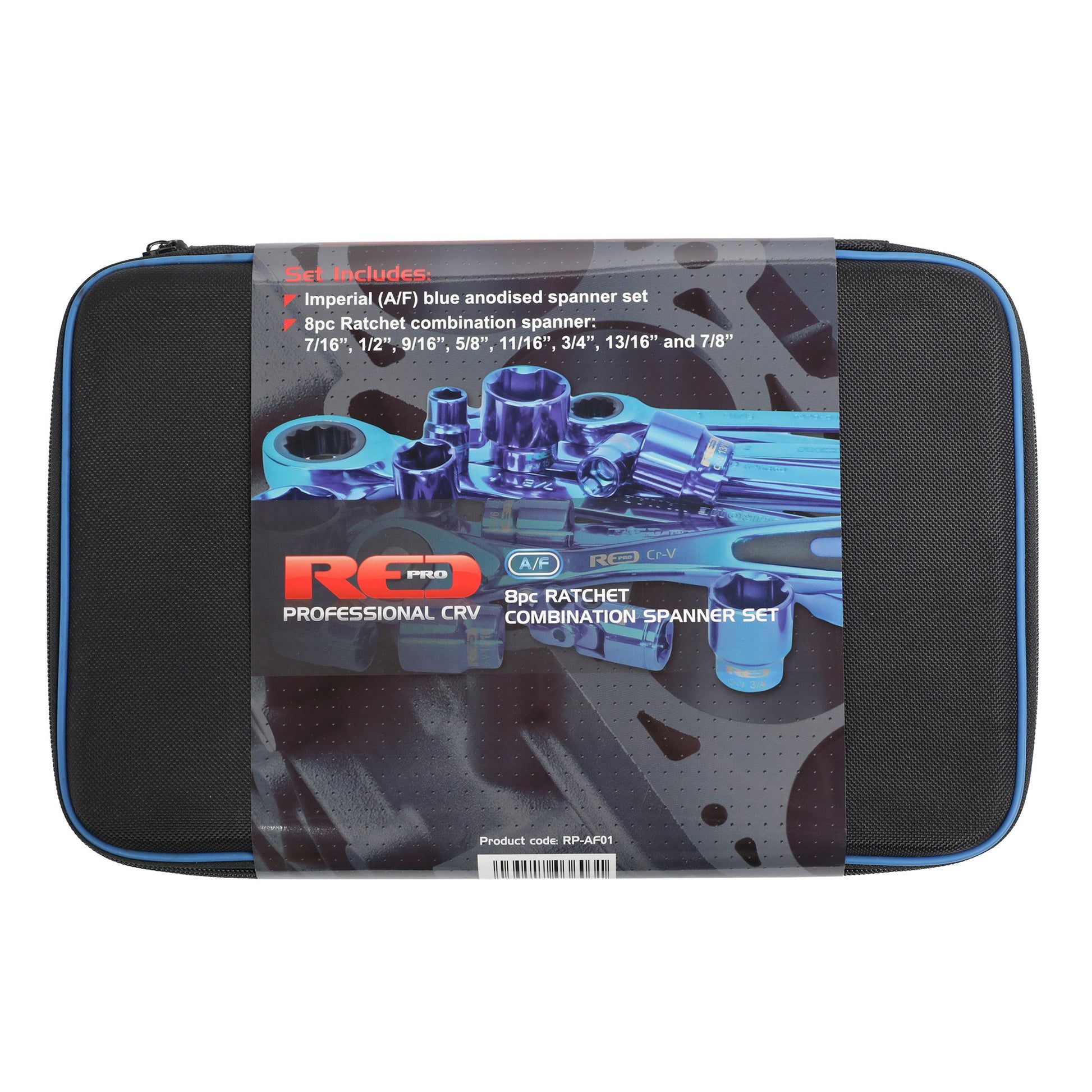 The Red Pro 8pc Ratchet Combination Spanner Set is supplied in a ballistic nylon zip case with an EVA lining. The set is manufactured from CRV (Chrome Vanadium Steel).